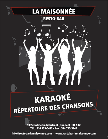 Client : Resto-Bar La Maisonnée Mandat : Conception et réalisation d'un catalogue de 300 pages répertoriant les 16 500 chansons karaoké Événement : Soirées karaoké