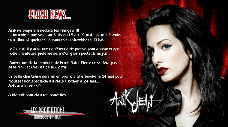 Client : Les Promos Marie-Jo Bastien Mandat : Conception et réalisation d'une série de e-cards pour Anik Jean Événement : Présentation des activités de promotion de l'artiste